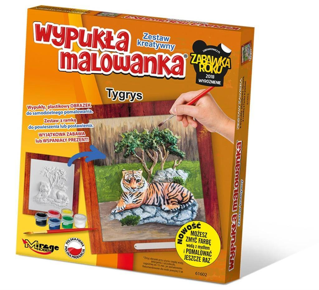 Wypukła Malowanka od Mirage Hobby to Zestaw Kreatywny dla osób powyżej 5. roku życia. Zestaw zawiera wypukły, plastikowy, kształtny obrazek, farbki akrylowe, pędzelek oraz ramkę z kartonu do postawienia lub powieszenia. Zmyj obrazek przy użyciu ciepłej wody, mydła i szczoteczki, najpóźniej do 15 min. po pomalowaniu. Obrazek ma odpowiedni do wzoru wypukły kształt, który jest dobrze odczuwalny w dotyku. Produkt jest wymyślony i wyprodukowany w Polsce! Wszelkie prawa zastrzeżone. Każda Wypukła Malowanka to konkretny wzór z danej serii. Kolekcja jest podzielona na różne serie np. Koty, Psy, Konie, Futrzaki, Dinozaury, Jednorożce, Kwiaty, Sport, Bajki, Zoo i inne. Seria Wypukła Malowanka Zestaw Kreatywny została nagrodzona Wyróżnieniem Zabawka Roku 2018.