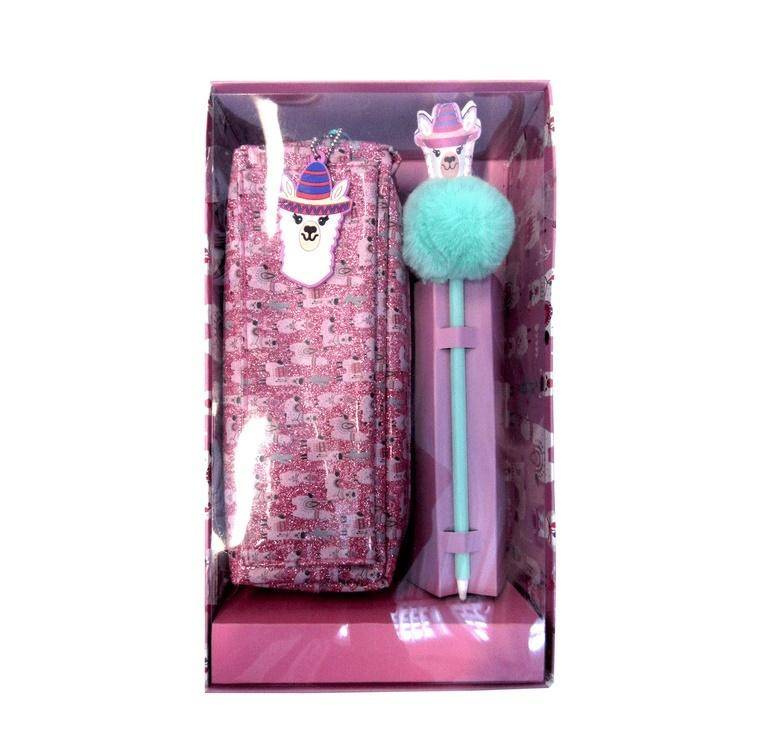 Piórnik brokatowy z długopisem z pomponem i ozdobną końcówką. Piórnik zapakowany jest w kolorowym pudełku prezentowym.