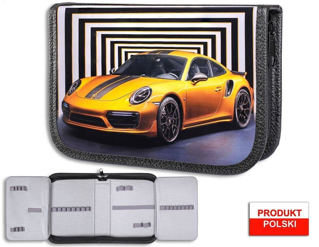 Piórnik twardy z 2 klapkami w środku, wykonany z kodury, ozdobiony obrazkiem przedstawiającym samochód. W środku piórnika znajdują się gumki umożliwiające trzymanie długopisów. Piórnik o wymiarach 20x14x5[cm]. Piórnik bez wyposażenia.