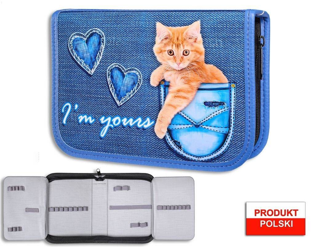 Piórnik twardy z 2 klapkami w środku wykonany z kodury, ozdobiony obrazkiem przedstawiającym kota. W środku piórnika znajdują się gumki umożliwiające trzymanie długopisów. Piórnik o wymiarach 20x14x5[cm]. Piórnik bez wyposażenia.