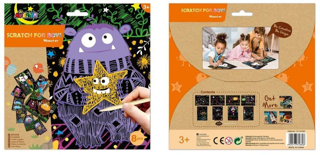 blister,230x230x10 mm","Avenir Scratch to zupełnie nowe podejście do prac ręcznych. Wyjątkowy arkusz, na którym tworzy się poprzez zdrapywanie warstwy wierzchniej, by odsłonić wielobarwną warstwę spodnią. Wydrapywanka to zabawka kreatywna najwyższych lotów, pozwalająca nie tylko tworzyć piękne prace, ale także dająca doświadczenia sensoryczne - dzięki użyciu odpowiedniego narzędzia i zachowywania się papieru podczas zabawy dziecko odbiera nowe wrażenia dotykowe. W zestawie: 4 wydrapywanki, patyczek, kolorowe muliny.