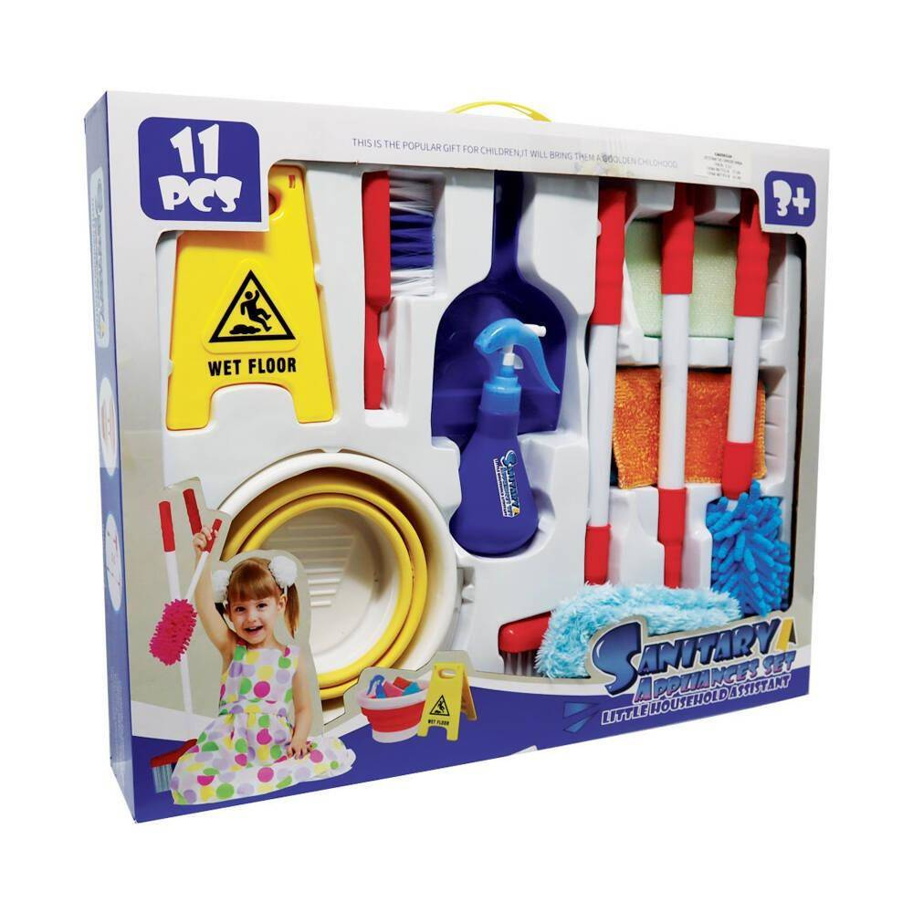 pudełko,545x440x85 mm","Zestaw do sprzątania, który zawiera: ścierkę, butelkę na płyn, mopa, szczotkę do kurzu, zmiotka, 2 szczotki do zamiatania, wiadro, znak ostrzegawczy. Produkt nie potrzebuje baterii. Zabawka przeznaczona dla dzieci powyżej 3 roku życia.