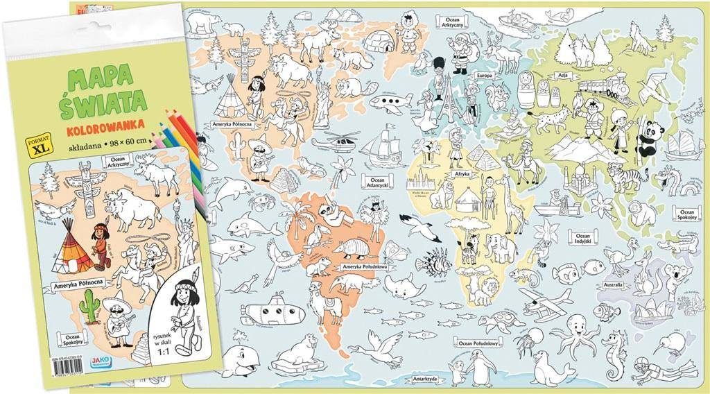 Ze składaną kolorowanką "Mapa świata" dzieci mogą wyruszyć w swoją pierwszą podróż dookoła globu. Poznają przy tym zwierzęta, rośliny, symbole i postacie charakterystyczne dla poszczególnych kontynentów. Kredki w dłoń! Ogromny, ilustrowany arkusz o wymiarach 98 x 60 cm jest do dyspozycji małego artysty.
