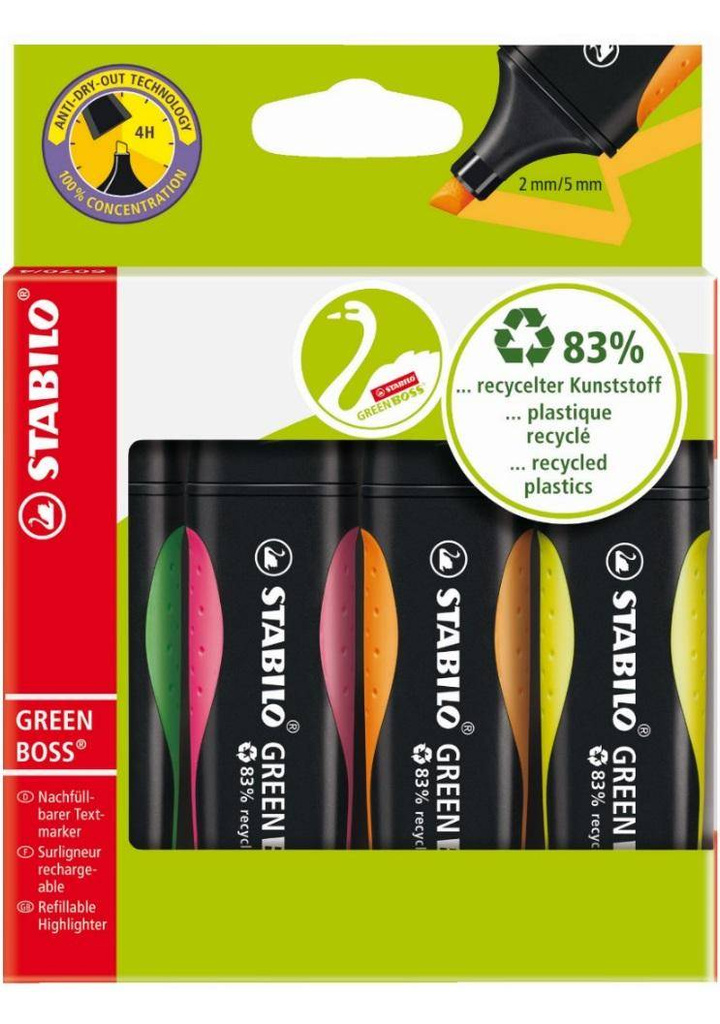 STABILO GREEN BOSS - klasyczny zakreślacz w wersji eko. Wykonany jest aż w 83% z plastiku, pochodzącego z recyklingu. Dzięki technologii STABIO Anti Dry-Out pozostawiony bez skuwki nie zasycha nawet przez 4 godziny. Grubość linii 2-5 mm. Dostępny w czterech podstawowych kolorach neonowych: żółty, pomarańczowy, zielony i różowy. Zakreślacze mogą też być ponownie napełniane za pomocą STABILO BOSS refill. Grubość linii 2-5 mm. Opakowanie: praktyczny zestaw na biurko zawierający 4 szt. oraz notes samoprzylepny Post-it wykonany z papieru pochodzącego w 100% z recyklingu.