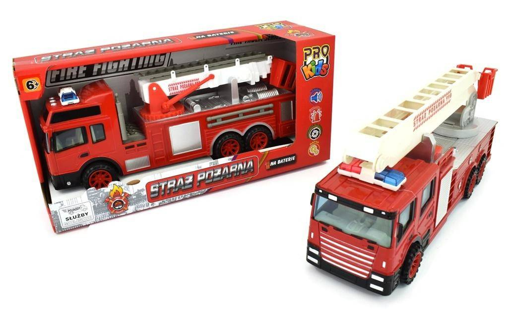 Wóz strażacki na baterie z dźwiękami i światłem syren. Pędź na ratunek własnym, wozem strażackim. Żaden chłopiec nie może się obyć bez samochodu strażackiego, dodatkowym uatrakcyjnieniem jest ruchoma wysuwana drabina.