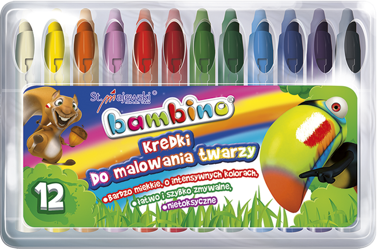 Kredki Bambino do malowania twarzy, 12 kolorówCechy produktu:bardzo miękkieintensywne koloryłatwo i szybko zmywalnenietoksyczneilość kolorów: 12