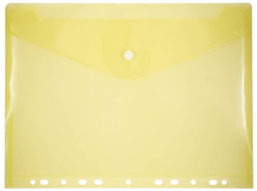 Koperta wykonana z kolorowego, transparentnego polipropylenu o grubości 0.18 mm. Zapinana na zatrzask. Europrofaracja umożliwia wpięcie teczki do segregatora, orientacja pozioma, wymiary 31,2x23,5 cm.