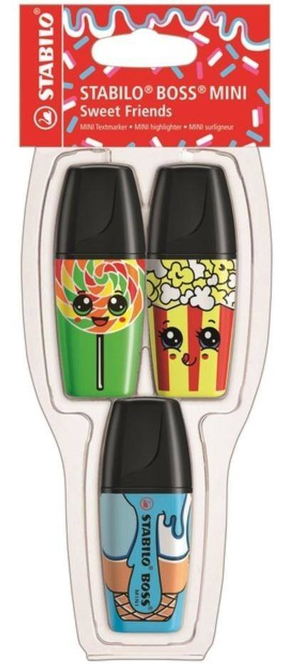 STABILO BOSS MINI Sweet Friends. Klasyczny już STABILO BOSS ORIGINAL w mini formacie z oryginalnymi motywami na obudowie. Dostępny w 5 neonowych kolorach z modnymi motywami na obudowie. Dwie grubości linii 2 i 5 mm. Atrakcyjne opakowanie. Pozostawiony bez skuwki nie zasycha nawet przez 4 godziny. Plastikowe opakowanie z zawieszką zawierające 3 szt. w kolorach żółtym, niebieskim, zielonym.