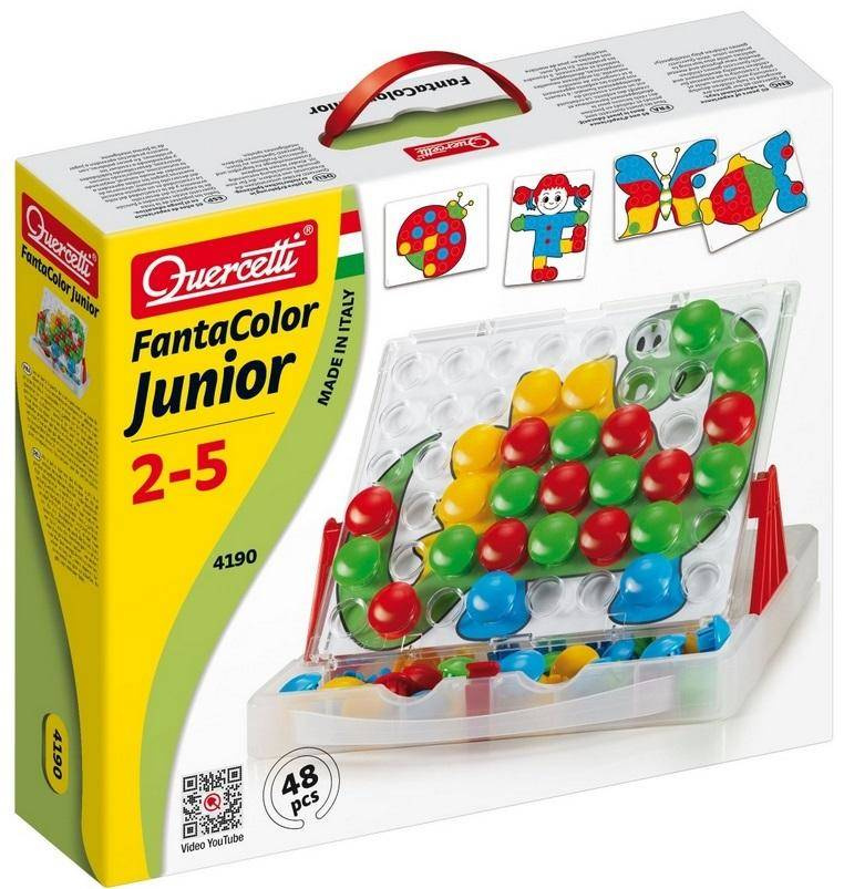 QUERCETTI MOZAIKA FANTACOLOR JUNIOR zestaw zawiera kolorowe kołeczki o średnicy -32mm, z których powstają piękne mozaiki. Aby tak się stało należy jedną z 8 kart ze wzorami umieścić pod przezroczystą tablicą, a następnie zacząć tworzyć mozaikę poprzez wstawianie kolorowych kołeczków w tablicę. Karty i kołeczki przechowywane są w zamykanej walizeczce z uchwytem. Zabawka rozwija koordynację wzrokowo-ruchową , precyzyjne umiejętności motoryczne oraz zachęca do twórczego myślenia. Zabawka została wyprodukowana we Włoszech.