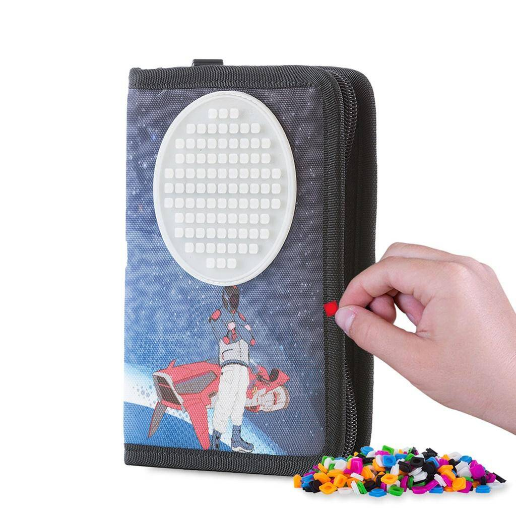 Szkolny piórnik na suwak PIXIE CREW z kosmicznym motywem, posiada kreatywny okrągły panel, lśniący w ciemności, na którym można tworzyć oryginalne i spersonalizowane grafiki, za pomocą małych silikonowych pikseli. Piórnik wykonany został z poliestru. Wewnątrz znajduje się wystarczająco dużo miejsca na przybory szkolne. Jest 16 klasycznych gumek, do których można wsunąć ołówki, czy długopisy oraz 4 szersze na linijkę, gumkę, czy nożyczki. Wnętrze zawiera także transparentną kieszonkę. Piórnik jest sprzedawany z dodatkowym darmowym zestawem około 69 pikseli.