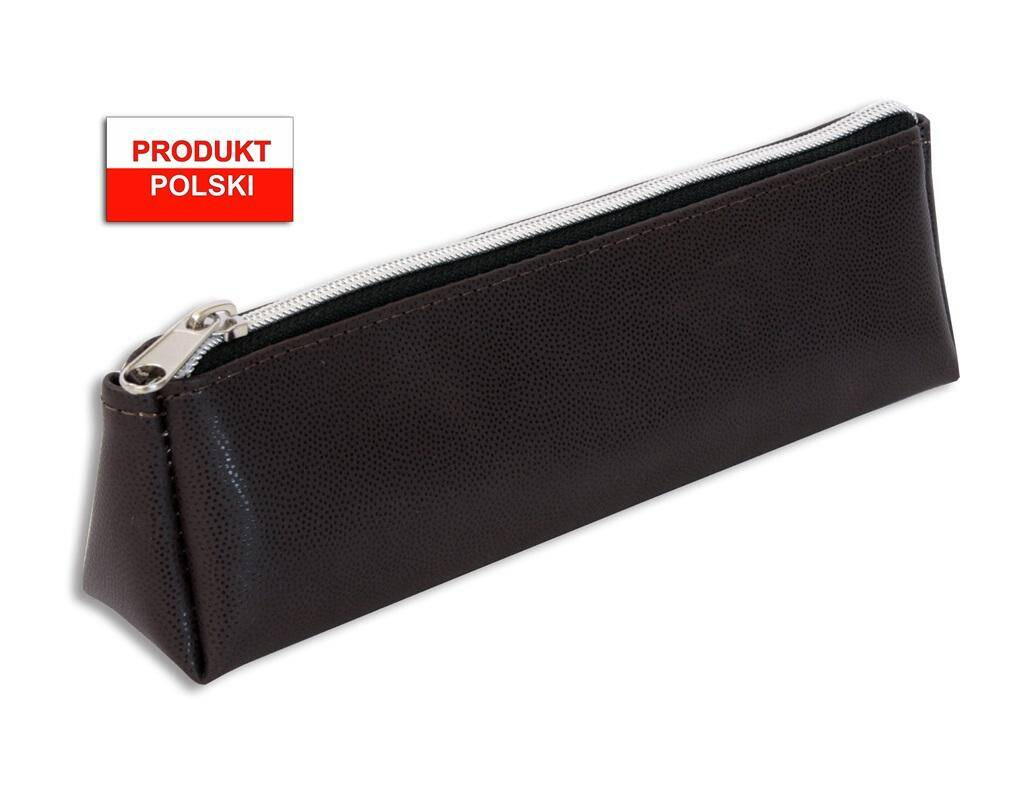 Piórnik kosmetyczka na długopisy zamykany zamkiem błyskawicznym. Wykonany z tkaniny skóropodobnej w kolorze brązowym. Wymiary 21 x 6,5 x 4,5 cm. Piórnik bez wyposażenia.