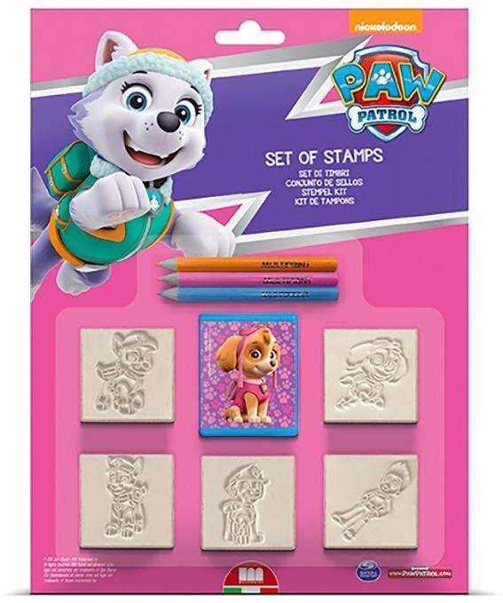 Pieczątki Psi Patrol dla dziewczynek. W skład zestawu wchodzą: 5 pieczątek, 1 poduszeczka do tuszu i 3 kredki.