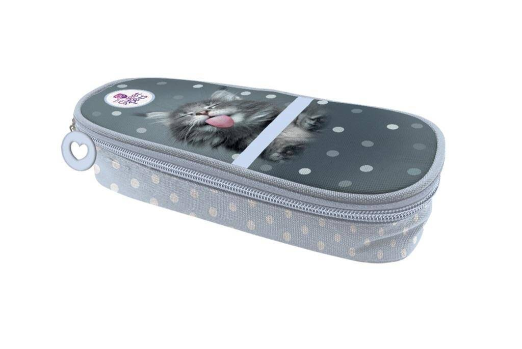 Owalny piórnik szkolny z klapką to niezbędny przedmiot uczniów. Wewnątrz na klapce znajdują się gumowe uchwyty na przybory do pisania oraz skrzydło, na którym jest kieszonka z siateczki zamykana zamkiem błyskawicznym i kolejne gumowe uchwyty. Komora główna jest pojemna, korpus dodatkowo usztywniany. Na piórniku znajduje się motyw z serii The Sweet Pets z kotem. Duży piórnik z organizerem oprócz najważniejszych przyborów szkolnych, pomieści także m. in. pomadkę ochronną, chusteczki czy mały krem do rąk. Dzięki ruchomej przekładce, można oddzielić produkty kosmetyczne od szkolnych .Wyróżnia się na tle konkurencji tym, że dłuższy.