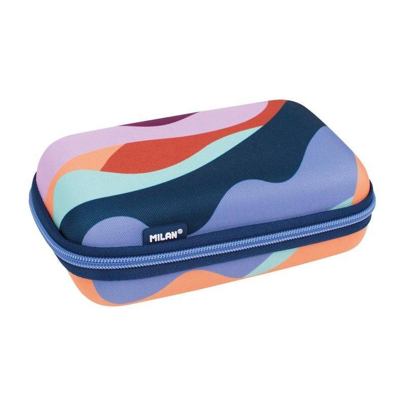 Usztywniany piórnik w twardej obudowie z 2 saszetkami z wyposażeniem. W środku 2 kwadratowe saszetki wypełnione przyborami MILAN, które można używać osobno lub jako całość. Dodatkowa kieszonka z siatki zapinana na suwak także wypełniona przyborami szkolnymi. Kolekcja THE FUN jest inspirowana zabawą i radością podczas procesu twórczego. Dzięki unikalnej palecie kolorów, różne kształty kolażu stają się nadrukiem tej kolekcji. Zawartość całego zestawu to: 3 długopisy CAPSULE (czarny, czerwony i zielony), ołówek drewniany HB, 1 linijka trójkątna 15 cm, 6 trójkątnych kredek o metalicznych kolorach w czarnym drewnie, 1 gumka do ścierania 4024 i 1 temperówka AFILA kwadratowa. Materiał zewnętrzny i wewnętrzny 100% poliester. Rozmiar: 21,5 x 13,5 x 6,5 cm.