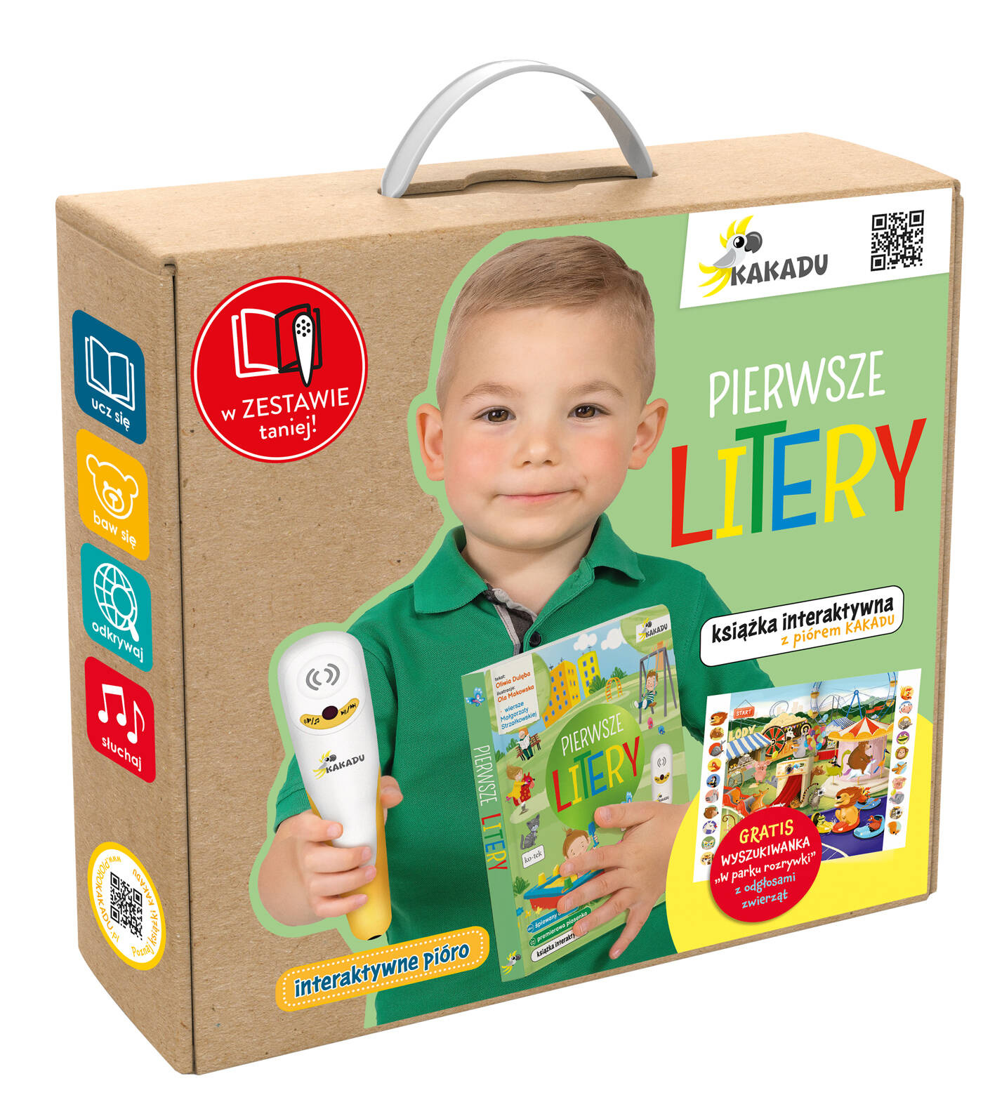 Zestaw zawiera: książkę Pierwsze litery, pióro Kakadu w trwałym etui i planszę z wyszukiwanką W parku rozrywki, dzięki której dzieci sprawdzą swoją spostrzegawczość, poznają nazwy zwierząt i usłyszą odgłosy, jakie one wydają. Całość została zamknięta w pudełku z rączką.