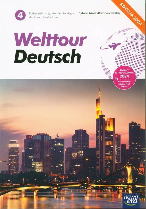 Edycja 2024. Publikacje dostosowane do zmian w podstawie programowej z 2024 r. Zawierają czytelne oznaczenia treści, które od września 2024 r. już nie obowiązują.Podręcznik Welttour Deutsch 4 spełnia wymagania podstawy programowej dla szkół ponadpodstawowych. Doskonale przygotowuje do egzaminu maturalnego na poziomie podstawowym i rozszerzonym. Gwarantuje ciekawą realizację wymagań programowych, dzięki niesztampowym materiałom oraz autentycznym i atrakcyjnym rozwiązaniom dydaktycznym. Można znaleźć wśród nich m.in.: zadania rozwijające komunikację, filmy niemieckiej telewizji ZDF inspirujące ucznia do rozmowy, dodatkowe lekcje gramatyczne i materiały przygotowujące do egzaminu maturalnego już od pierwszego poziomu serii, lekcje Starter wyrównujące poziom startowy uczniów, dodatkowy rozdział Welttour Magazin poszerzający tematy leksykalne z podręcznika oraz dający możliwość personalizacji nauczania.