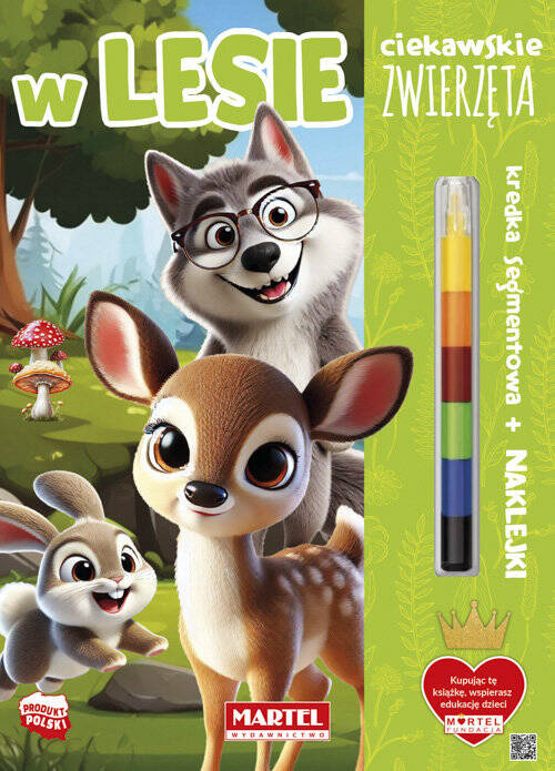 Czas na przygodę w lesie, gdzie kryją się rozmaite zwierzęta gotowe na wspólną zabawę! Niedźwiadek Norbert, lisek Leszek, sowa Sabinka, jeż Jerzy i reszta sympatycznych przyjaciół liczą na Twoją pomoc w odnalezieniu odpowiednich naklejek. A gdy już wykonasz zadanie, udekoruj obrazki za pomocą segmentowej kredki, która pozwala błyskawicznie zmieniać kolory i tworzyć unikalne kompozycje.