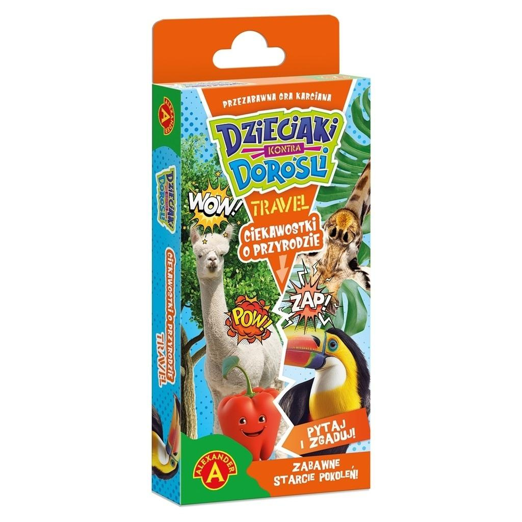 ""Dzieciaki Kontra Dorośli - Ciekawostki o Przyrodzie Travel"" to gra planszowa, która zapewni świetną zabawę całej rodzinie. Dzieci rywalizują z dorosłymi, odpowiadając na ciekawe pytania dotyczące przyrody. Dzięki dwóm oddzielnym zestawom kart z pytaniami o innym poziomie trudności dedykowanym dzieciom oraz rodzicom, szanse na wygraną są takie same dla obu drużyn.