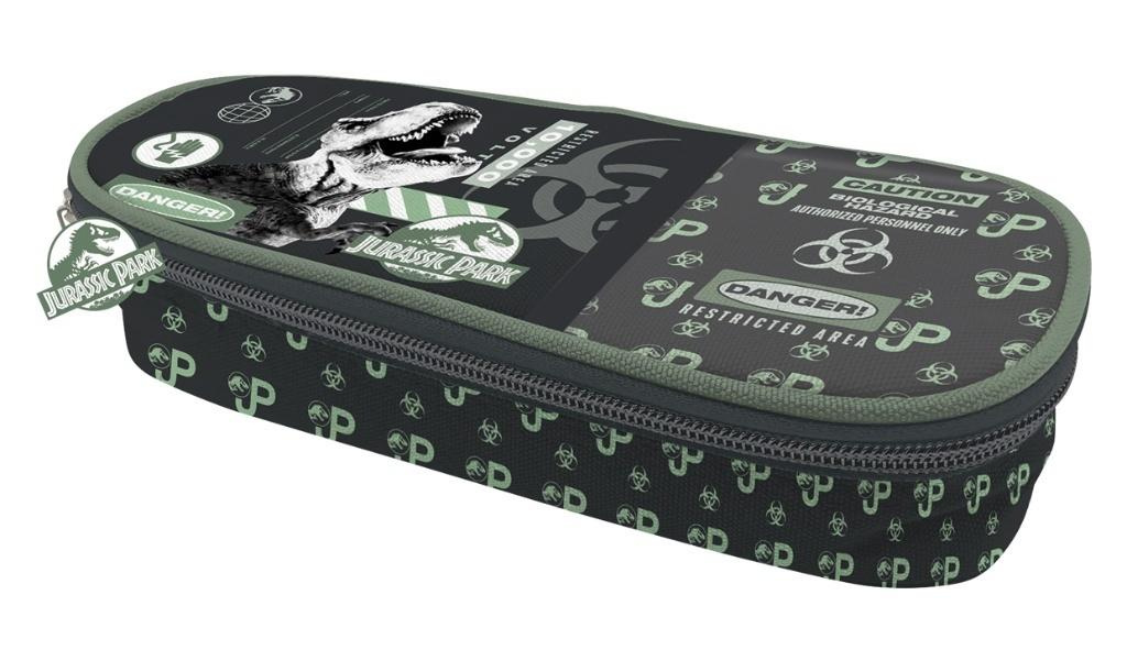 Owalny piórnik szkolny z klapką to niezbędny przedmiot uczniów. Wewnątrz na klapce znajdują się gumowe uchyty na przybory do pisania oraz skrzydło, na którym jest kieszonka z siateczki zamykana zamkiem błyskwicznym i kolejne gumowe uchwyty. Komora główna jest pojemna, korpus dodatkowo usztywniany. Na piórniku znajduje się motyw z serii Jurassic Park. Duży piórnik z organizerem oprócz najważniejszych przyborów szkolnych, pomieści także m. in. pomadkę ochronną, chusteczki czy mały krem do rąk. Dzięki ruchomej przekładce, można oddzielić produkty kosmetyczne od szkolnych .Wyróżnia się na tle konkurecji tym, że dłuższy.