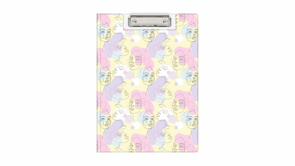 Wykonana z folii PVC z pełnym, ozdobnym nadrukiem, wewnątrz usztywniona tekturą. Wyposażona w sprężysty mechanizm zaciskowy służący do przytrzymywania kartek papieru. Wewnątrz, na całej szerokości, podłużna kieszeń z miejscem na długopis na zgięciu okładek. Wersja zamykana, z okładką. Służy jako sztywna podkładka do pisania, z funkcją teczki, podczas konferencji, spotkań, jak i codziennej pracy. Format A4.