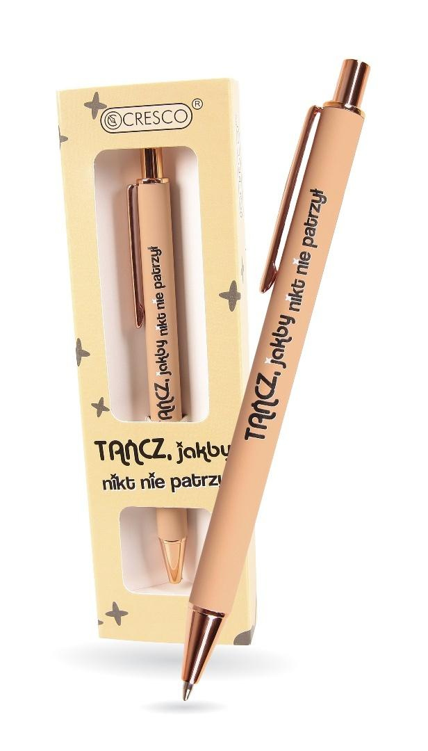 Długopis automatyczny z wymiennym wkładem 1mm. Kobieca kolorystyka, softowy, pastelowy korpus ze wykończeniami w odcieniach różowego złota. Nadruk na długopisie i pudełeczku to Tańcz, jakby nikt nie patrzył. Dodatkowo wzbogacony nadruk o wyjątkową grafikę. Długopis zapakowany w prezentowe etui GB, w sam raz na upominek dla NIEJ.
