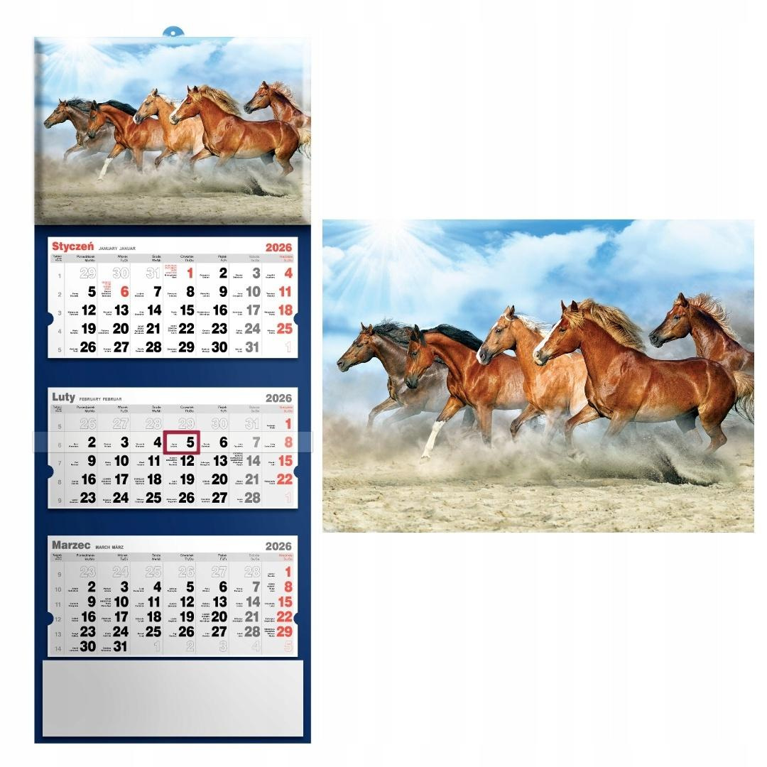 KALENDARZ TRÓJDZIELNY 2026 WYMIAR CAŁKOWITY KALENDARZA: 32 x 85,5cm GŁÓWKA KALENDARZA: Zdjęcie uszlachetniane folią błysk, z efektem wypukłości. KALENDARIUM: wym. 28,5 x 14 cm, trójjęzyczne (PL, GB, D), z numeracją tygodni i imieninami jest przytrzymywane przez kartonowe wypustki, które zapobiegają jego odstawaniu od plecków kalendarza. WYKOŃCZENIE: kartonowa zawieszka, pasek z czerwonym przesuwanym okienkiem, miejsce na notatki. WYMIAR ZDJĘCIA 32 x 22 cm ZDJĘCIE Z EFEKTEM WYPUKŁOŚCI: uszlachetnione folią błysk.