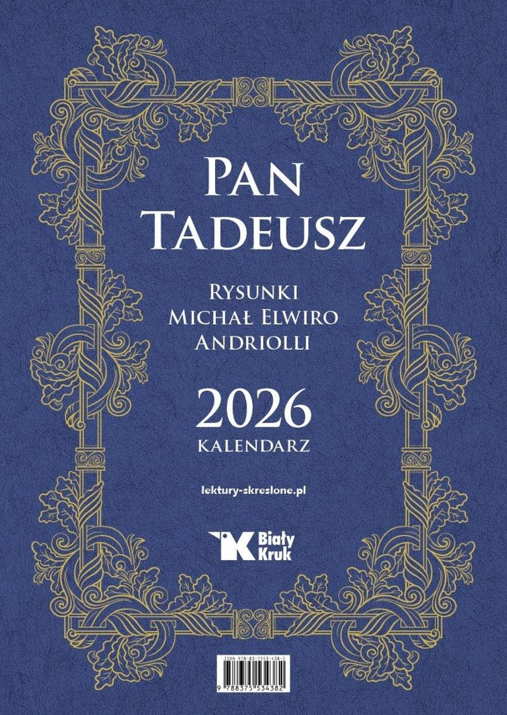 Kalendarz to coś więcej niż tylko kartka z datami - towarzyszy nam każdego dnia. Dlatego warto, żeby był nie tylko praktyczny, ale i piękny. Takie właśnie są eleganckie, estetyczne kalendarze ścienne na 2026 rok przygotowane przez Białego Kruka. Fantastyczne ilustracje, ważne tematy, duży format - będą ozdobą w każdym domu, w każdym miejscu pracy. Wszystkie najważniejsze święta katolickie, uroczystości liturgiczne oraz imieniny zostały wyraźnie zaznaczone. "Pan Tadeusz" to kolejna edycja bestsellerowego kalendarza z rysunkami Michała Elwiro Andriollego do narodowej epopei. Każdy miesiąc to inny obraz, ale i inny cytat z genialnego poematu Adama Mickiewicza, cenzurowanego dzisiaj i rugowanego ze szkół. Warto mieć go na ścianie, by pamiętać, na przekór tym wszystkim, którzy dzisiaj chcą zniszczyć Polskę. Format 305x430 mm, osobna plansza na każdy miesiąc, czytelne kalendarium, elegancki kredowy papier 150 g., lakierowana utwardzana okładka 200 g., mocne tekturowe plecki przez cały format kalendarza, elegancka biała spirala do zawieszenia kalendarza.