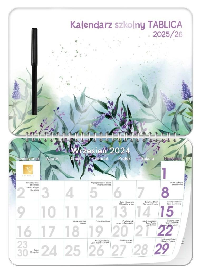 "Kalendarz ścienny. Układ kalendarium miesięczny. Format po rozłożeniu 260 mm x 360 mm. Kalendarz na spirali z tablicą suchościerną, + mazak, 12 str, od września do sierpnia, + na każdej karcie miejsce na notatki."