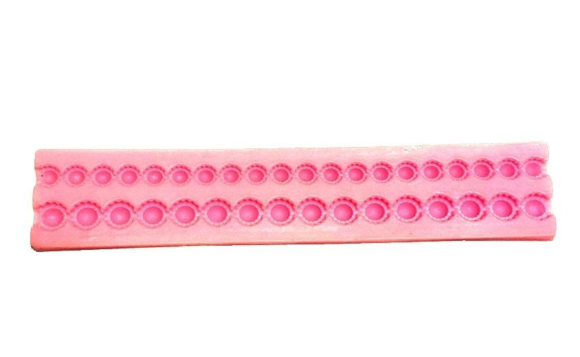 Forma silikonowa wielkości 19 cm x 4 cm do odlewów z gipsu, mas plastycznych, plasteliny, modeliny, mas cukierniczych itp.Z formy jest możliwość odlania lub stworzenia 2 elementów w kształcie bordiury z kryształków-klejnocików.