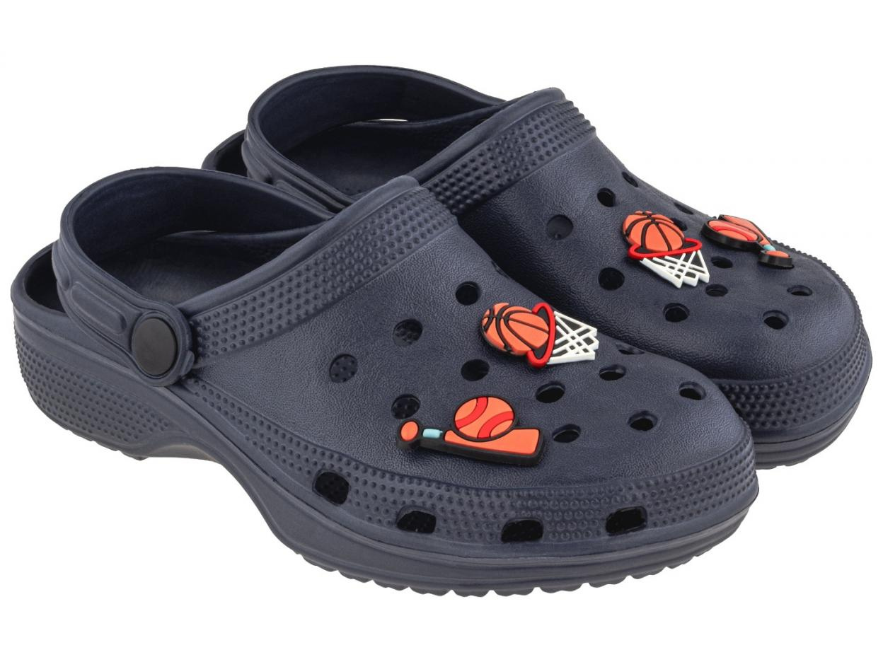 Praktyczne i stylowe clogi dziecięce w kolorze granatowym to idealne obuwie na lato - świetne na plażę, do ogrodu, czy codziennego użytku. Model ozdobiony został gumowymi pinami o sportowej tematyce - na każdym clogu znajdują się 3 piny, które można dowolnie przekładać i umieszczać w otworach wentylacyjnych. To nie tylko ciekawy element dekoracyjny, ale też zabawa dla dziecka, które może samodzielnie personalizować swoje buty. Clogi wykonane są z miękkiego, elastycznego i wytrzymałego tworzywa EVA, które jest lekkie, wodoodporne i łatwe do czyszczenia. Dzięki temu idealnie sprawdzają się zarówno w domu, jak i na zewnątrz, np. podczas letnich aktywności. Dla większego komfortu i bezpieczeństwa buty wyposażone zostały w ruchomy pasek na piętę, który pomaga utrzymać stopę we właściwej pozycji podczas chodzenia, zapobiegając jej wysuwaniu się Długość wkładki: 18 cm