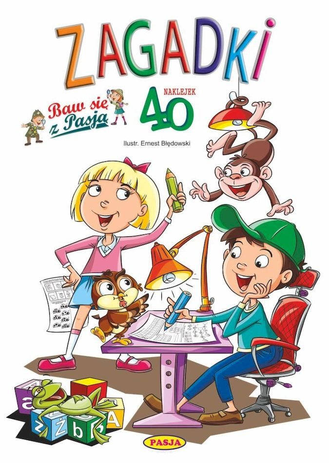 Książka edukacyjna z zadaniami logicznymi (łamigłówki, zgadywanki, zagadki), kolorowanie.