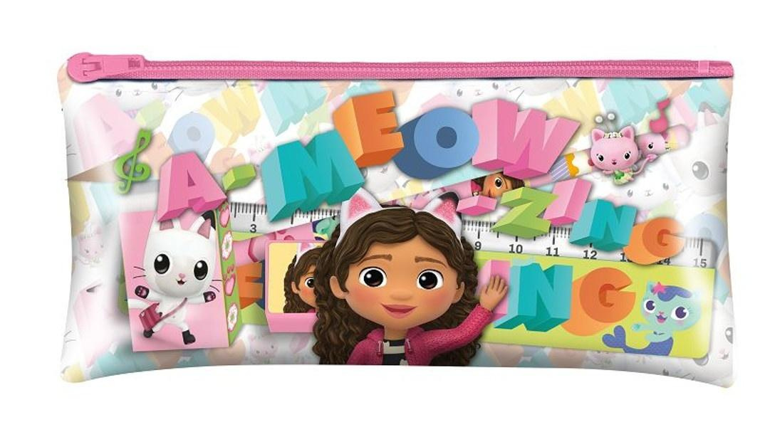 Piórnik Gabby's Dollhouse z najfajniejszymi postaciami. Ten piórnik zawiera cztery niezbędne elementy, abyś mógł zacząć: Ołówek, Temperówka, Gumka, Linijka 15cm.