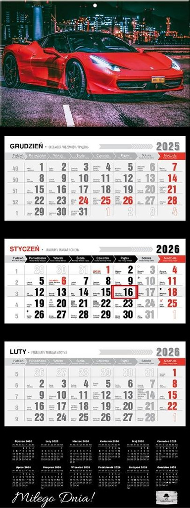 Kalendarz 2026 Trójdzielny PREMIUM Z WYPUKŁĄ GŁÓWKĄ. Format 315/810mm. Trzy komplety klasycznych kalendariów z przesuwnym okienkiem. Główka wypukła z otworem wierconym. Dodatkowo nazwy miesiąca i dni tygodnia w języku Ukraińskim, Angielskim i Niemieckim. Kalendarium dodatkowo zawiera fazy księżyca i znaki zodiaku. Dużo miejsca do notowania, czytelne duże litery i cyfry. DODATKOWO PRZEDŁUŻONE PLECKI KOLOREM DOPASOWANE DO WZORU ZE SKRÓCONYM KALENDARIUM NA ROK 2026. Nowoczesne i klasyczne wzornictwo, dopracowane wzory, czytelne kalendarium. Praktyczny i elegancki kalendarz który sprawdzi się zarówno w domu, biurze jak i innych pomieszczeniach.