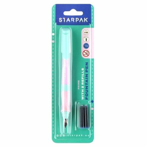 Pióro wieczne STARPAK Prime Pastel 1 o kształcie dostosowanym do dłoni dziecka, z wytrzymałą stalówką, wykonaną z wysokiej jakości materiału. Specjalnie wyprofilowana, antypoślizgowa strefa uchwytu zapewnia komfort i pomaga w nauce pisania Twojego dziecka. Zapoznaj się również z innymi produktami dedykowanymi biurze i szkole! W piórze znajduje się miejsce na zapasowy wkład, dzięki czemu Twojemu dziecku nigdy nie zabraknie atramentu w trakcie pisania. W zestawie dwa naboje wymienne. Pióro w kolorze różowo-zielonym. Zestaw pakowany na blistrze. Produkt nieodpowiedni dla dzieci poniżej 3 lat. Wymiary produktu (pióro) 16 cm. Wymiary opakowania (wys. szer.) [cm] 23x7 Waga opakowania {kg.} 0,03 kg.