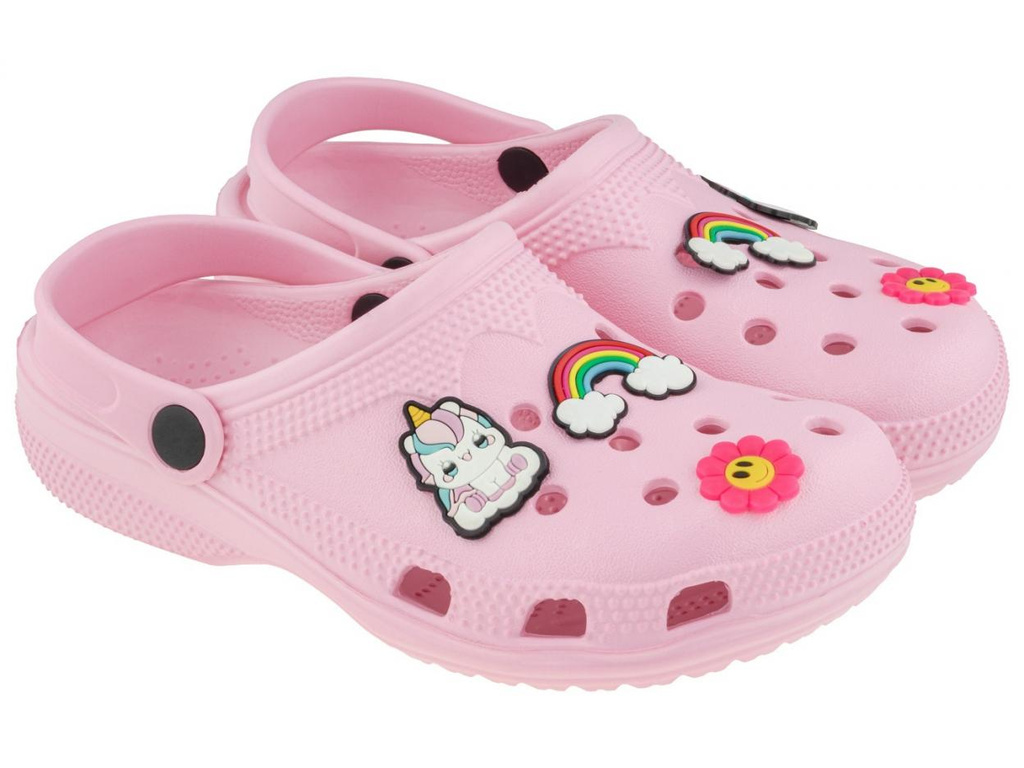 Urocze clogi dziewczęce w kolorze różowym to idealne obuwie na lato - sprawdzą się zarówno w domu, jak i na zewnątrz, np. w ogrodzie, na plaży czy podczas wakacyjnych wyjazdów. Model został ozdobiony gumowymi pinami w kształcie jednorożca, tęczy i kwiatka - po trzy na każdego cloga. Piny można dowolnie przekładać i umieszczać w otworach wentylacyjnych, co daje dziecku możliwość personalizacji i zabawy wyglądem obuwia. Clogi wykonane są z miękkiego, lekkiego i elastycznego tworzywa EVA, które zapewnia wysoki komfort noszenia, jest łatwe w czyszczeniu i odporne na wilgoć. Dzięki swojej lekkości buty nie męczą stopy nawet po wielu godzinach noszenia. Dodatkowo model wyposażony został w ruchomy pasek na piętę, który można przełożyć do przodu lub zostawić z tyłu - co pomaga utrzymać stopę we właściwym miejscu i zwiększa stabilność podczas chodzenia. Długość wkładki: 22 cm
