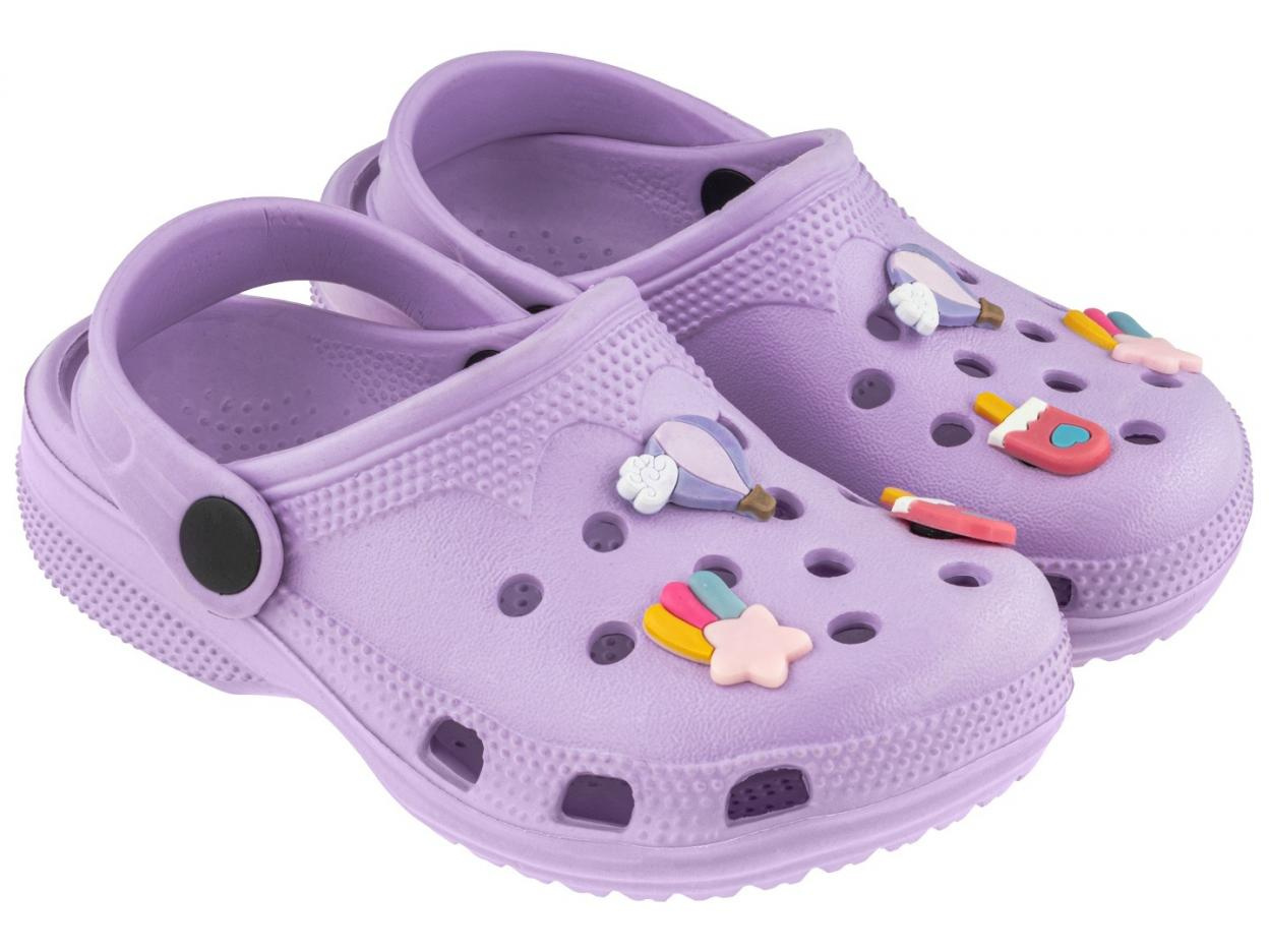 Urocze clogi dziewczęce w kolorze liliowym to idealne obuwie na lato - sprawdzą się zarówno w domu, jak i na zewnątrz, np. w ogrodzie, na plaży czy podczas wakacyjnych wyjazdów. Model został ozdobiony gumowymi pinami w kształcie lodów, balona i spadającej gwiazdki - po trzy na każdego cloga. Piny można dowolnie przekładać i umieszczać w otworach wentylacyjnych, co daje dziecku możliwość personalizacji i zabawy wyglądem obuwia. Clogi wykonane są z miękkiego, lekkiego i elastycznego tworzywa EVA, które zapewnia wysoki komfort noszenia, jest łatwe w czyszczeniu i odporne na wilgoć. Dzięki swojej lekkości buty nie męczą stopy nawet po wielu godzinach noszenia. Dodatkowo model wyposażony został w ruchomy pasek na piętę, który można przełożyć do przodu lub zostawić z tyłu - co pomaga utrzymać stopę we właściwym miejscu i zwiększa stabilność podczas chodzenia. Długość wkładki: 16 cm
