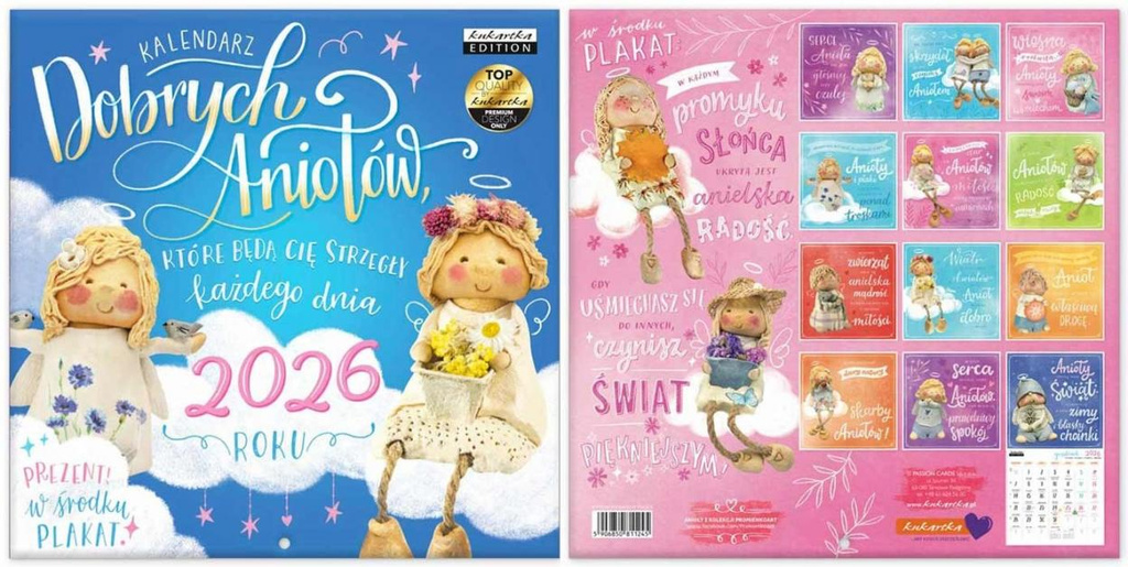Kalendarz 2026 Dobre Anioły Kwadratowy kalendarz ścienny na rok 2026 z aniołami. Każdy miesiąc cieszy pięknym zdjęciem anioła, który będzie wspaniałą ozdobą Waszego domu. Kalendarz po rozłożeniu ma wymiary 30x60 cm - górny kwadrat wypełnia zdjęcie, a dolny kalendarium. PREZENT: W środku kalendarza znajdziecie plakat o wielkości 30x 60 cm Specyfikacja: Wielkość: 30 x 30 cm (po rozłożeniu 30 x 60 cm) Gratis: plakat Styl: cytaty, nowoczesny, klasyczny, zdjęciowy