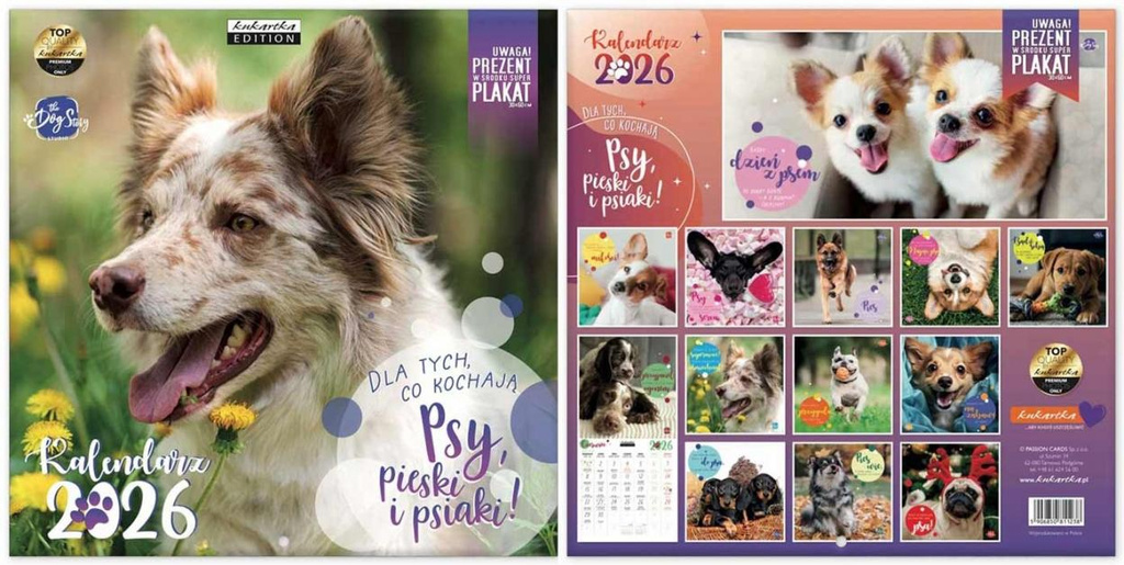Kalendarz 2026 Psy, pieski i psiaki Kwadratowy kalendarz ścienny na rok 2026 z serii "Psy, pieski i psiak". Każdy miesiąc przyozdabia inny psiak, który będzie wspaniałą ozdobą Waszego domu. Taki kalendarz to idealny prezent dla miłośników psów. Kalendarz po rozłożeniu ma wymiary 30x60 cm - górny kwadrat wypełnia zdjęcie, a dolny kalendarium. PREZENT: w środku kalendarza znajdziecie plakat ze zdjęciem psiaka o wymiarach 30x 60 cm Specyfikacja: Wielkość: 30 x 30 cm (po rozłożeniu 30 x 60 cm) Gratis: plakat Styl: cytaty, nowoczesny, klasyczny, zdjęciowy