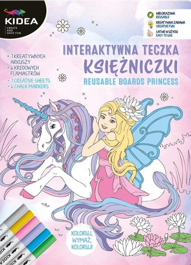 Teczka zawiera 6 kredowych flamastrów w wygodnym etui oraz różnorodne powierzchnie do tworzenia. Trzy tablice ścieralne i cztery papierowe karty oferują szerokie możliwości: pustą tablicę do swobodnego rysowania, wzorki ze szlaczkami i rysunkami do nauki pisania i ćwiczenia motoryki ręki oraz gotowe motywy do kolorowania. Teczka zamykana na rzepy utrzymuje wszystkie elementy na swoim miejscu. Doskonała na podróże i jako alternatywa dla tradycyjnych materiałów papierniczych.