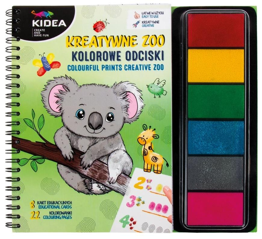 Książeczka kreatywne zoo do malowania paluszkami. Wybierz wzór z książki, który chcesz wypełnić możesz skorzystać ze stron edukacyjnyc, ucząc się liczyć, stworzyć bardzo łatwo zwierzaka przy pomocy odcisków palców albo pokolorować jeden z obrazków znajdujących się w środku. Dotknij gąbeczki z wybranym kolorem kilkukrotnie, możesz także przyłożyć palec do kilku gąbeczek, aby zmieszać ze sobą barwy i utworzyć nowe kolory. Przyciśnij paluszki w odpowiednich miejscach na arkuszu. Baw się eksperymentując z kolorami i różnymi odciskami. A może chcesz zabawić się w detektywa? Ta wyjątkowa książeczka zawiera gąbeczki z kolorowymi tuszami, 21 kolorowanek oraz 8 kart edukacyjnych