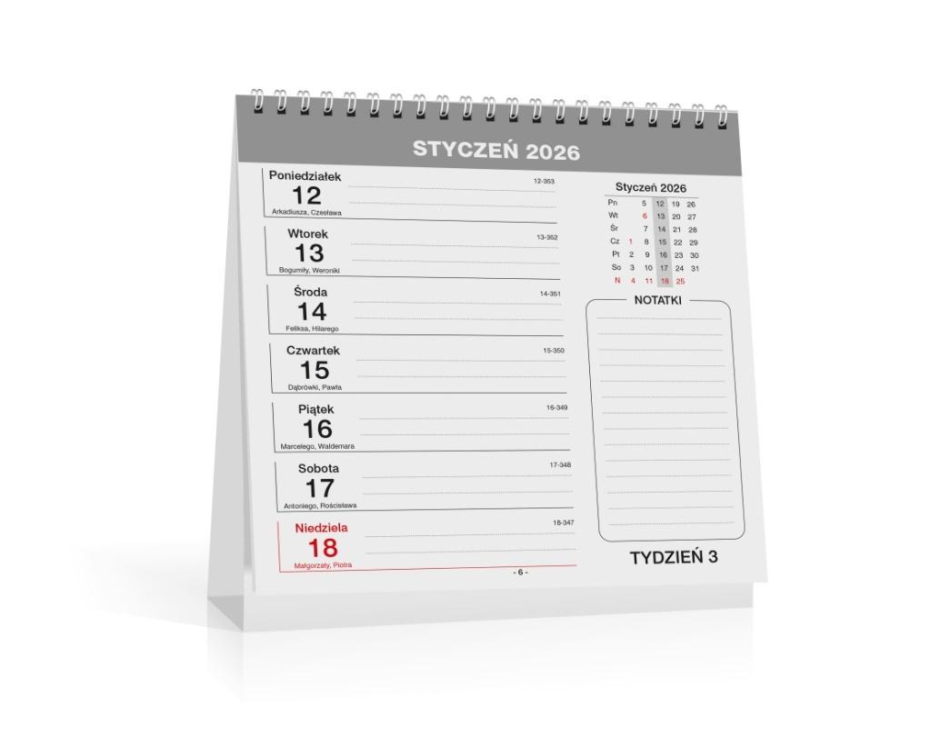 "Kalendarz biurkowy typu namiot, kalendarium w układzie miesięcznym, 56 stron + okładka. Na spirali, papier w środku kreda mat. Wymiary 185x182 mm"