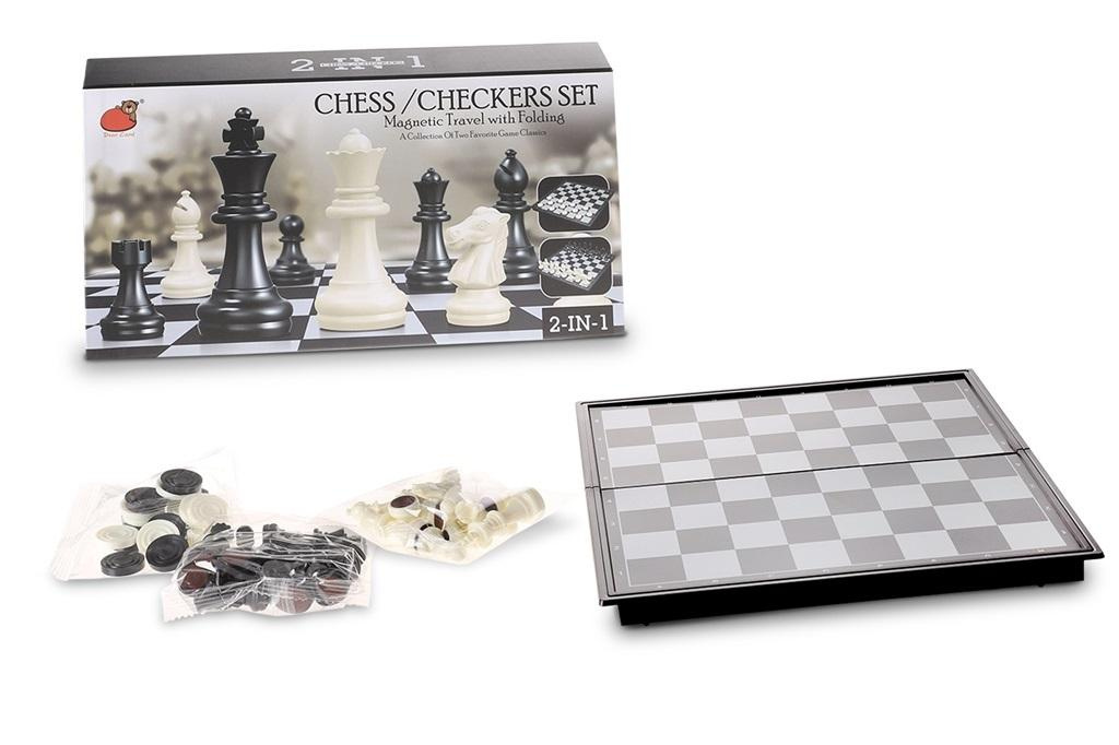 W zestawie: pudełko na figury z nadrukiem planszy, figury do szachów i warcabów, pozostałe informacje: wym. opak. 25,5 x 13 x 4 cm, 6+
