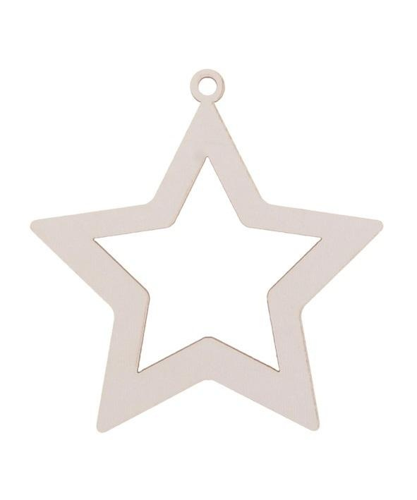 Drewniana bombka w kształcie gwiazdy biała. Średnica 8cm, wysokość całkowita 9cm. W opakowaniu 3szt