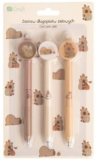 Zestaw trzech uroczych zmazywalnych długopisów żelowych z motywem kapibar.
