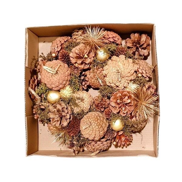 Elegancki stroik / wieniec na Boże Narodzenie, o średnicy około 25-30cm. Nadaje się do powieszenia na drzwiach, oknie lub położenia na stole. Otwór w środku pozwala na umieszczenie dużej świecy.