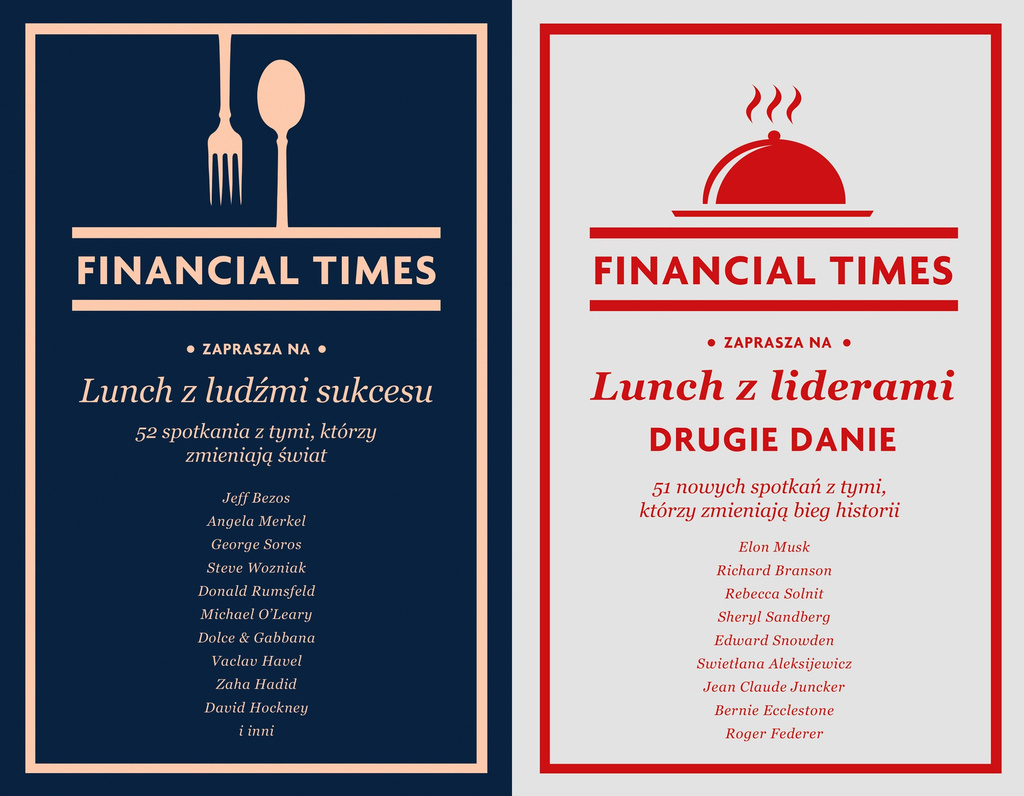 "Financial Times" zaprasza na Lunch z ludźmi sukcesu- gość wybiera restaurację, a wydawca reguluje rachunek. Rozmówcy rozluźniają się przy obiedzie i butelce wina, pozwalając sobie na otwartość, autentyczność, a nawet niedyskrecję.