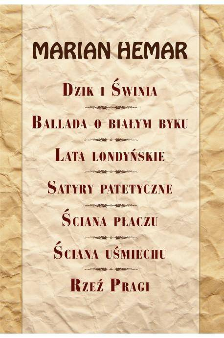 Na niniejszy tom składa się siedem wydanych pierwotnie osobno tomików poetyckich Mariana Hemara: Dzik i Świnia (Lwów 1922), Ballada o białym byku (Lwów, 1923), Lata londyńskie (Londyn 1946), Satyry patetyczne (Londyn 1947), Ściana płaczu (Londyn 1968), Ściana uśmiechu (Londyn 1968) oraz Rzeź Pragi (Londyn 1968). Zostały one przygotowane przez samego autora i opublikowane za jego życia, dlatego zbiór, który trzymają Państwo w dłoniach, zachowuje ich kolejność chronologiczną oraz oryginalny układ utworów w obrębie każdego z tomików. Są one przecież ważnym punktednego z najbardziej znanych i lubianych poetów polskich XX wieku.