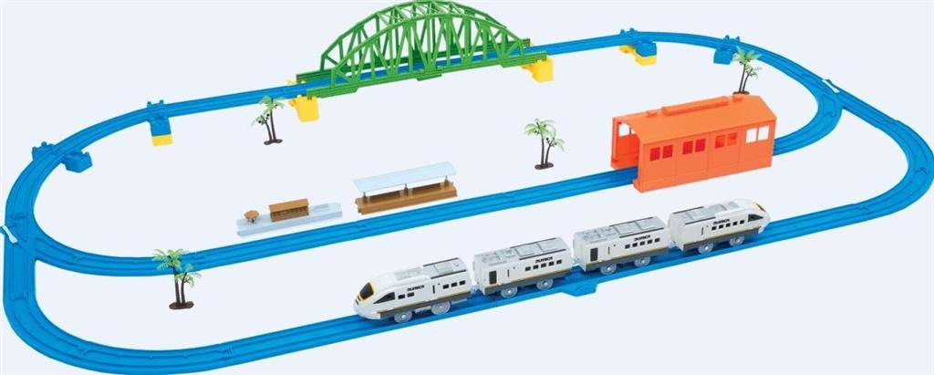 Zestaw zawiera : 43 elementy: most- 1szt, tory i zwrotnice- 25szt, podpórki- 6szt, poczekalnia- 1szt, drzewka- 4szt, garaż- 1szt, poczekalnia- 1szt, lokomotywa- 2szt, wagon- 2szt