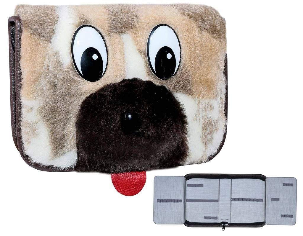Piórnik z 2 klapkami w środku uszyty z futra. Piórnik o wymiarach 20x14x5[cm].Kolor beżowy