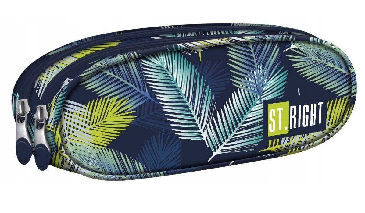 Pojemny i funkcjonalny piórnik dwukomorowy. Charakteryzuje się bardzo starannym wykonaniem oraz pięknym wzorem w tropikalne liście na ciemnym tle. Piórnik uszyto z wytrzymałego i wodoodpornego materiału. Dwie oddzielne komory pomieszczą wszystkie potrzebne akcesoria. Komory zamykane są na suwaki, zakończone dużymi poręcznymi pullerami. Piórnik jest doskonałym uzupełnieniem do plecaka St.Right dostępnego w tej samej wersji kolorystycznej.